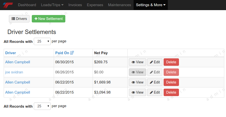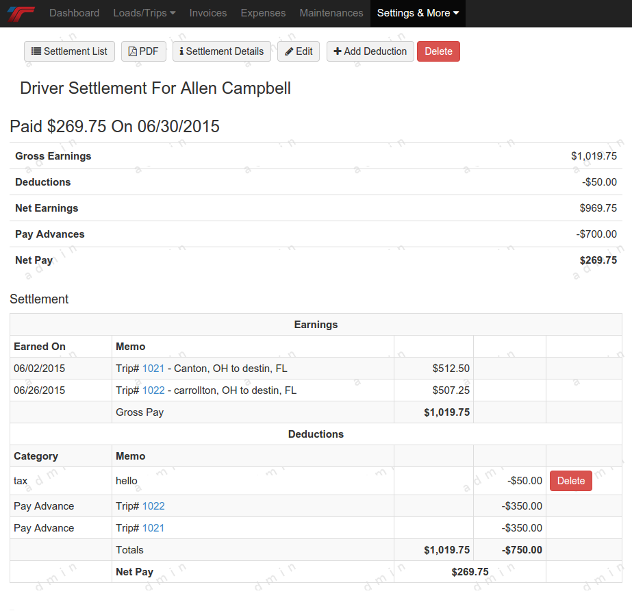 The settlements allow you to track the pay for all the trips connected to it. It also allows you to assign deductions to the settlement. Once you are done, you can print or email off a PDF that included both a summary, and all the details used to generate the settlement.