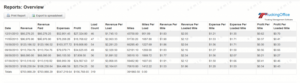 The Company Overview Report collects all the data – all your dispatches, expenses, payments – and uses that data to present you with a simple report that might just change your business forever.  You think I’m being a bit dramatic?  I don’t think so.  When I learned what my expenses per mile were, I started to understand why I wasn’t more successful and what I had to change to make more money.Overview Report Like those truckers who feel that a blown tire ruins their revenue, it’s possible to look at expenses per load.  That distorts the true image of how the business is doing because it’s based on too little data.  By looking at a larger period of time – like a month – you can get a better view of how business is doing as a whole when a repair isn’t making your bottom line look like it’s an outline of Florida.  When you add a month’s data together, you can see a bigger picture.  You’ll know what a good rate is, what’s the minimum you need to make a profit,  and when you maybe should pass on a load instead of taking it just to get out of Florida. When I saw that I was taking bad loads that were convenient, or were long so I didn’t think the price per mile was a big problem – I understood what had to change. That’s why you need to know your expenses per mile. How can you find your expenses per mile?  I recommend trying TruckingOffice free of charge.  Put in your dispatches and your expenses for the past month and add in this month’s – and see what you can discover about your trucking business.
